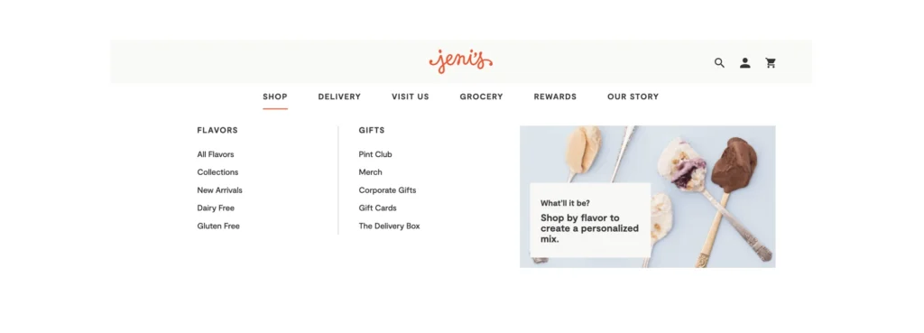 Jeni’s showcases all of their ice cream options, as well as other useful customer information, on their top navigation bar.