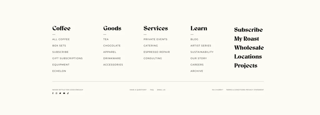 Depending on what industry you’re in, you’ll want to include copyright information, legal disclaimers, terms and conditions, and privacy policies. Brands can also make the footer navigation user-friendly by including links to: