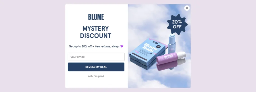 Blume entices customers to sign up for emails with the promise of a mystery discount.