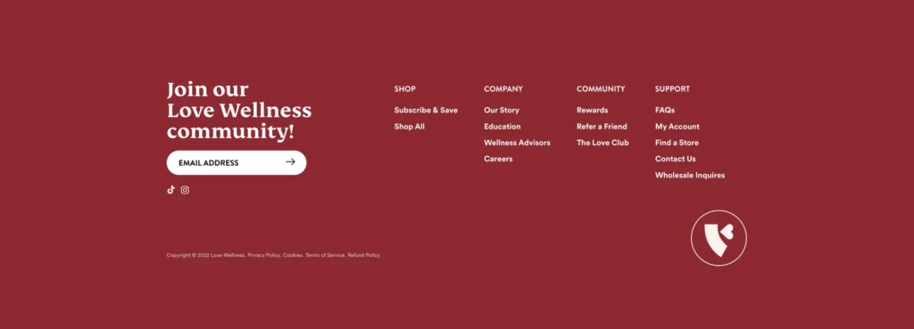 Love Wellness has a well-thought-out footer navigation, with all the necessary information and links.