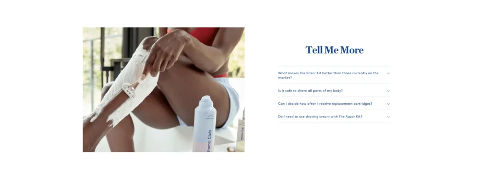 The Athena Club answers customer questions directly on the product page with a helpful FAQ.