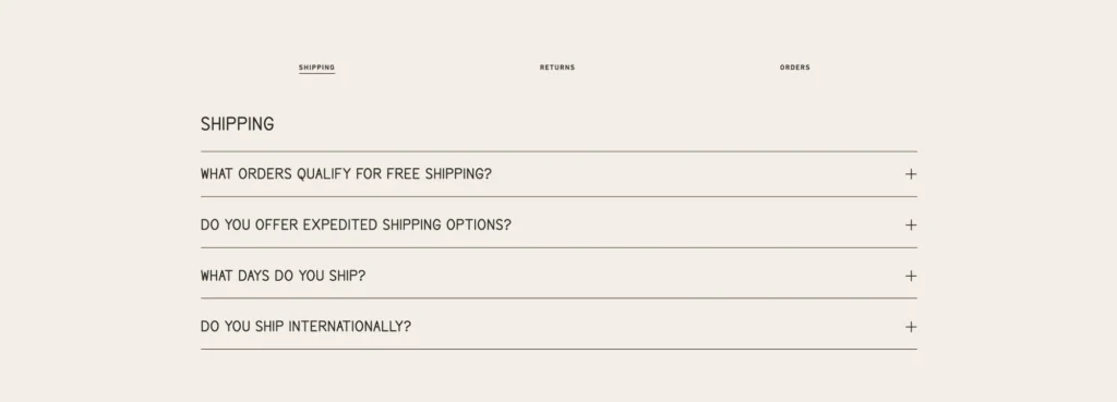 Whether it’s on the same page as your brand story, history, and mission, or included in the Help Center, you’ll be able to predict customer questions and answer them in a straightforward fashion with a store FAQ.
