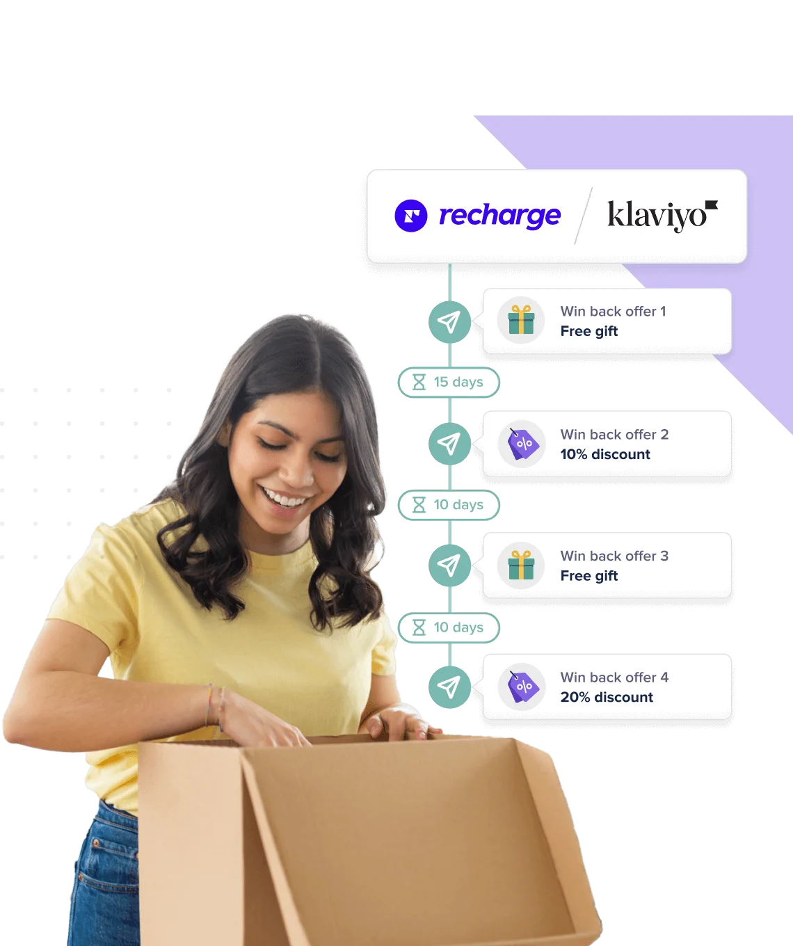 Build campaigns and deploy notifications directly in Recharge, or handle outreach with third-party tools like Klaviyo. Either way, you can endlessly customize notifications, landing pages, and incentives.