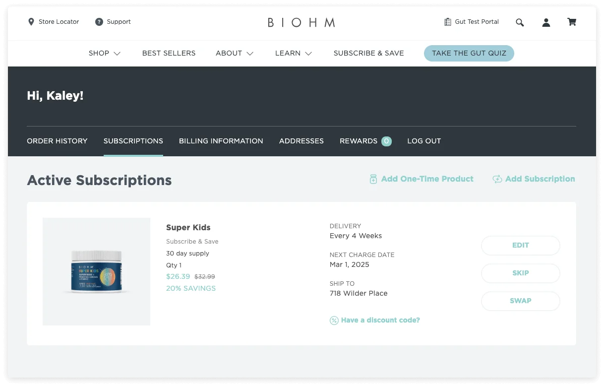 “Recharge as a tool definitely helps us keep our subscribers around, whether it’s allowing them to manage their subscription on their own, or making sure their entire experience is seamless.”