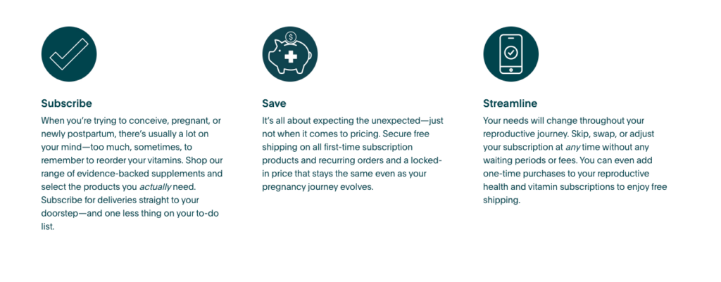 Natalist lays out how their subscriptions can directly address some of their customers’ pain points in their “Subscribe, Save, Streamline” graphic. Each point communicates benefits of subscribing that take into account the fact that customers are all in various stages of being on a reproductive journey:
