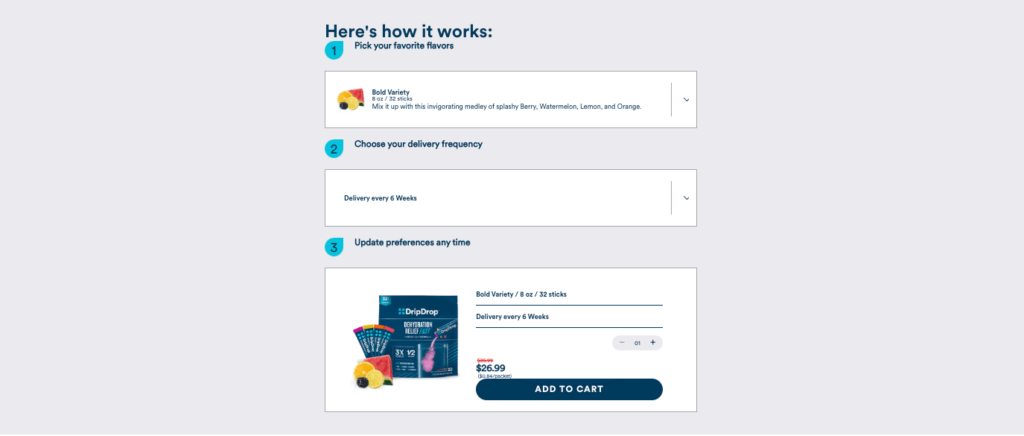 Further down, DripDrop simplifies the subscription process for users with their interactive “Here’s how it works” section. Users simply pick their favorite product flavors and a delivery frequencyThen DripDrop creates their custom subscription pack, displays their subscription savings, and enables them to add to cart. Simple as that!