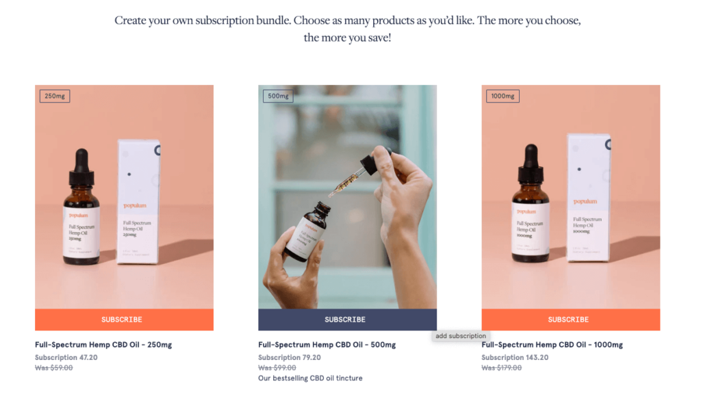 Populum uses their subscription landing page to make subscriptions to their line of CBD products feel accessible, allowing customers to more easily understand each product and how to use it, which helps keep them from getting overwhelmed.