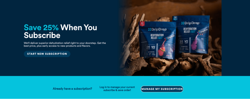 DripDrop’s subscription page emphasizes the most compelling benefit of their subscription program at the very top of their landing page, which reads “Save 25% When You Subscribe” in large type. On their very first glance, customers that visit the page understand the value of subscribing, and can even respond to the “Start New Subscription” call to action with one simple click.