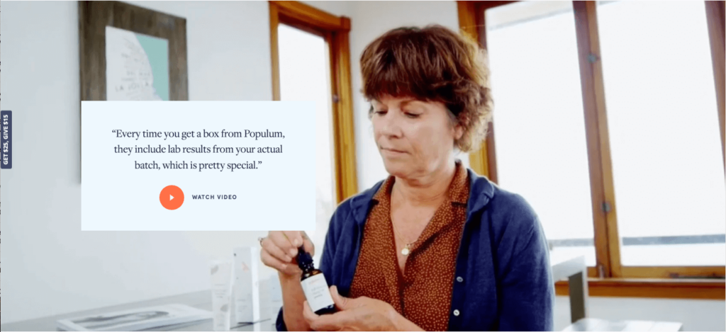Populum has also embedded a video on their page titled “How A Retired Nurse Used CBD.”In the video testimonial, the retired nurse explains what she uses Populum for, goes through her products, and explains their effects. This engaging addition educates potential customers who might not be as familiar with the uses of CBD.