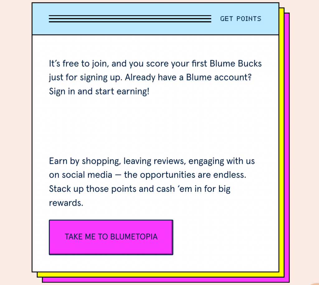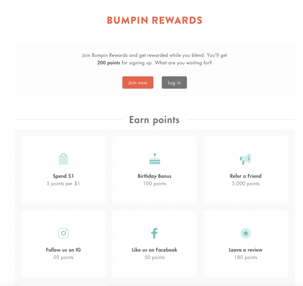To use your loyalty program to encourage word-of-mouth referrals, you can list referrals as one of the benefits that can earn your customers rewards and other points, as Bumpin Blends does in the example above.